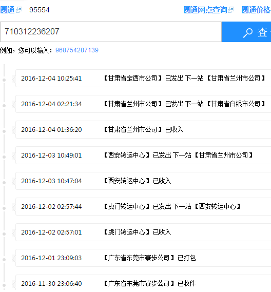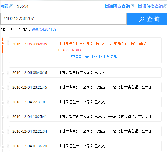 圓通快遞 運(yùn)單號(hào) 710312236207一般3到4天收到貨,現(xiàn)在7天沒收到。原因是圓通甘肅甘肅把我發(fā)白銀的貨發(fā)定西去了,從定西發(fā)回蘭州。再發(fā)白銀,蘭州離白銀70公里走了34個(gè)小時(shí)。大圓通95554電話聯(lián)系干脆拒接。我不明白這樣的公司怎么還能生存。行走路線截圖給大家看看。