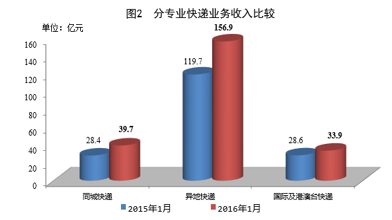 1月,全國(guó)快遞服務(wù)企業(yè)業(yè)務(wù)量完成21.6億件,同比增長(zhǎng)49.1%;業(yè)務(wù)收入完成291.7億元,同比增長(zhǎng)38.1%。其中,同城業(yè)務(wù)收入完成39.7億元,同比增長(zhǎng)39.9%;異地業(yè)務(wù)收入完成156.9億元,同比增長(zhǎng)31%;國(guó)際及港澳臺(tái)業(yè)務(wù)收入完成33.9億元,同比增長(zhǎng)18.2%。
