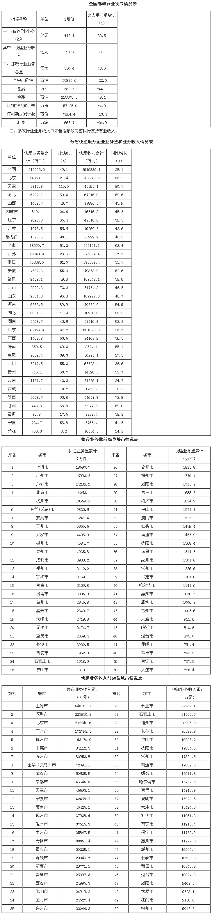 1月,郵政企業(yè)和全國(guó)快遞服務(wù)企業(yè)業(yè)務(wù)收入(不包括郵政儲(chǔ)蓄銀行直接營(yíng)業(yè)收入)完成442.1億元,同比增長(zhǎng)32.5%;業(yè)務(wù)總量完成530.4億元,同比增長(zhǎng)43%。
